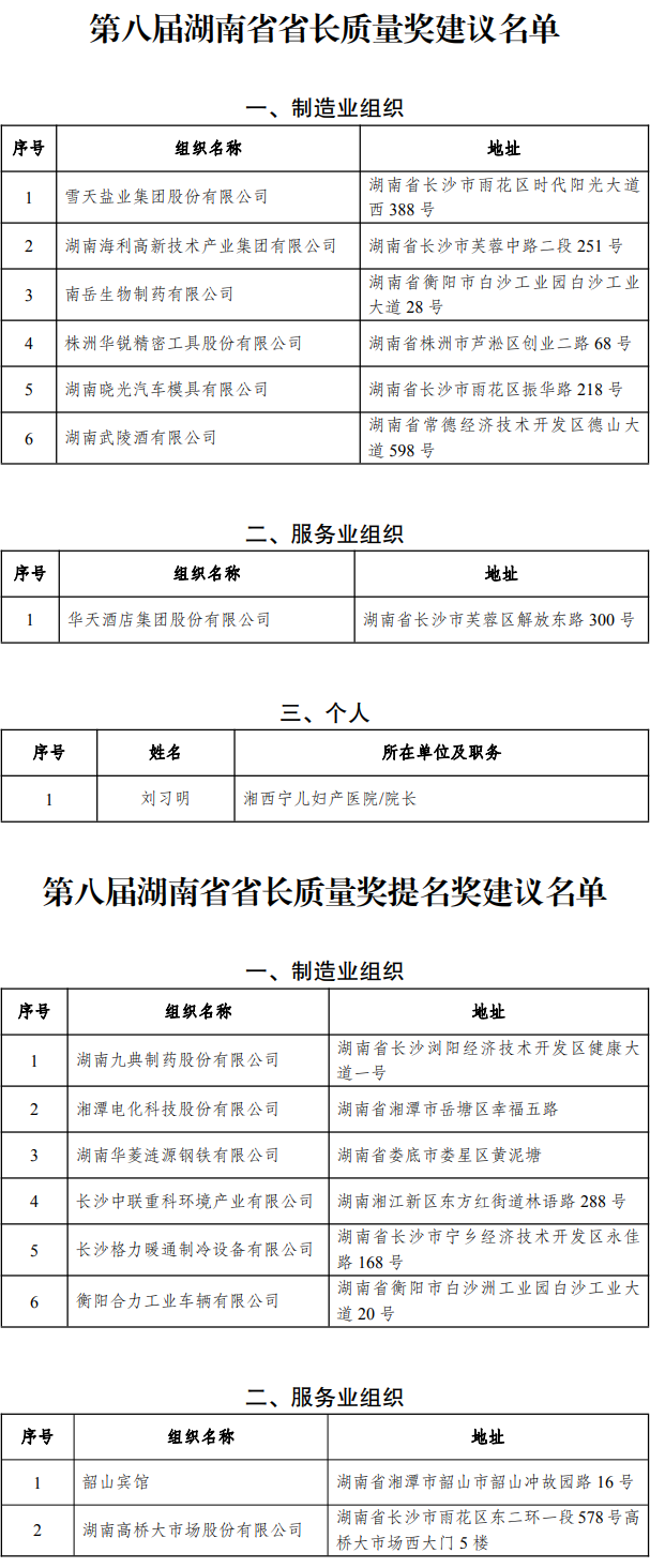 第八屆湖南省省長(zhǎng)質(zhì)量獎(jiǎng)及提名獎(jiǎng)建議名單公示