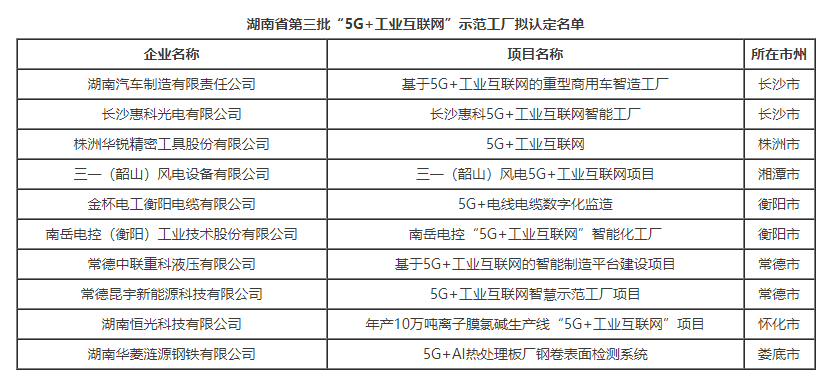 關(guān)于湖南省第三批“5G+工業(yè)互聯(lián)網(wǎng)”示范工廠(chǎng)擬認(rèn)定名單的公示