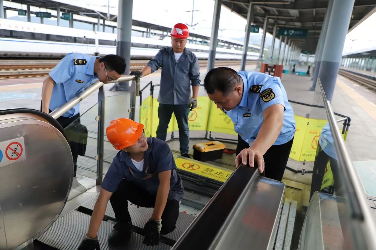圖為市場監(jiān)管干部職工開展高鐵南站扶梯安全保障