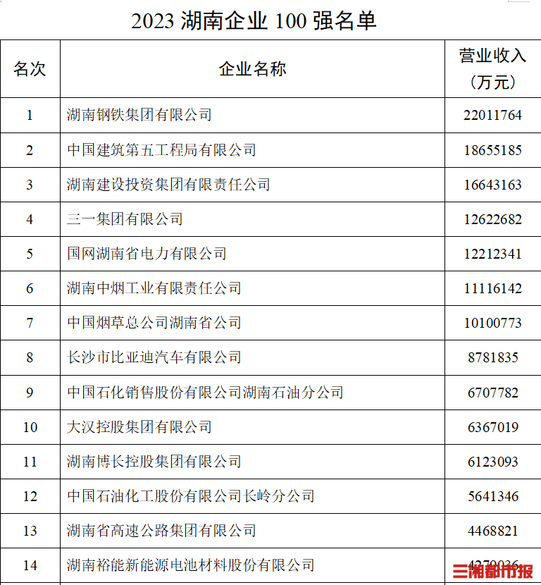 在2023湖南制造業(yè)企業(yè)100強(qiáng)名單中,湖南鋼鐵集團(tuán)有限公司、三一集團(tuán)有限公司、湖南中煙工業(yè)有限責(zé)任公司居前三名,后兩家公司的營收分別為1262億元和1112億元。在2023湖南服務(wù)業(yè)企業(yè)50強(qiáng)名單中,國網(wǎng)湖南省電力有限公司、中國煙草總公司湖南省公司、中國石化銷售股份有限公司湖南石油分公司分別以1221億元、1010億元、670億元的營收排名前三。